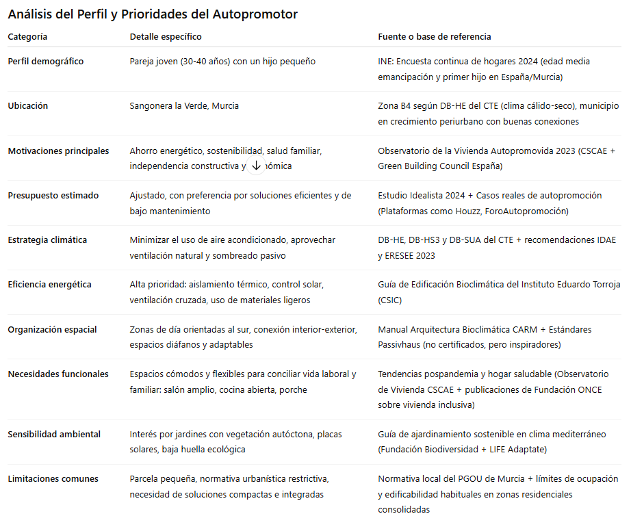 Prompt: “Resume perfil y prioridades de un autopromotor joven con familia que busca vivienda bioclimática en Murcia.”