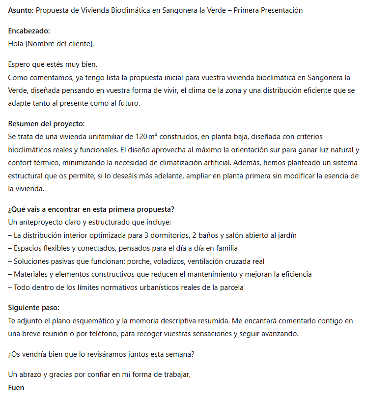 Prompt: “Escribe email profesional para presentar vivienda bioclimática a cliente joven. Después, genera descripción visual para DALL·E.”