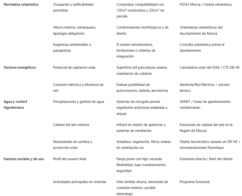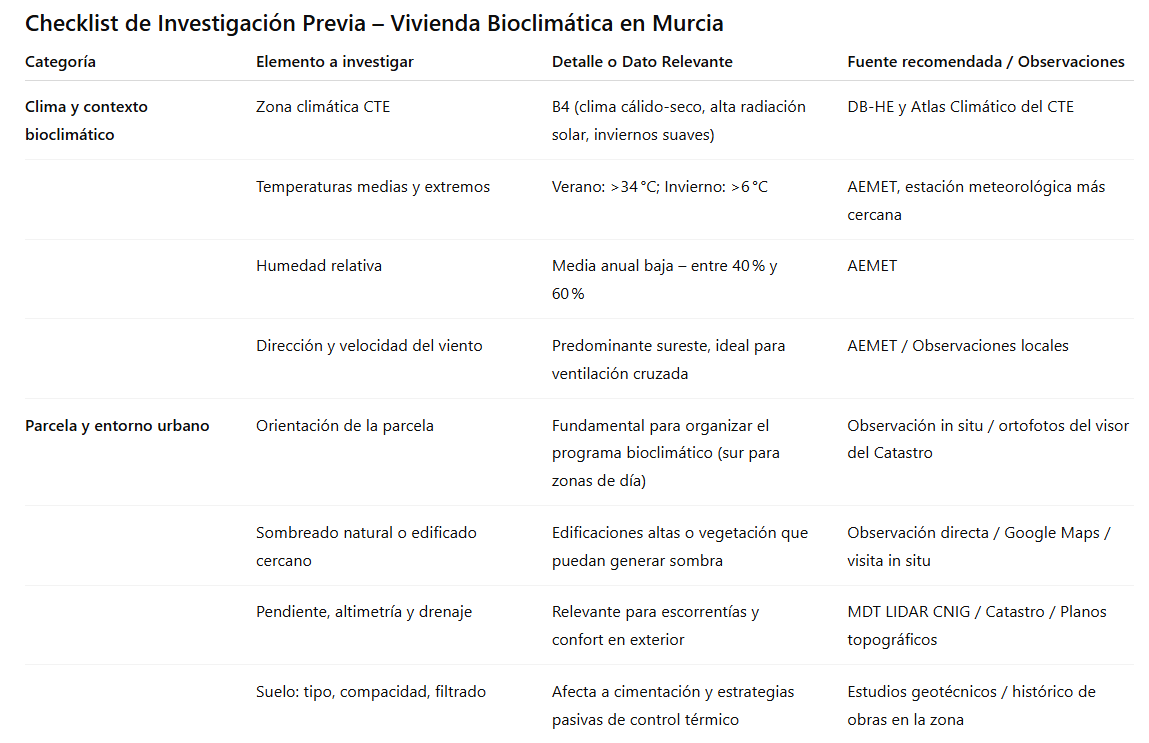 Prompt 1: “Genera un checklist de investigación previa para vivienda bioclimática en Murcia en formato tabla con datos de interés relevantes.”