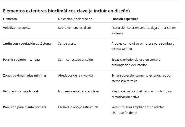 Resultado: Zona día → salón + cocina al sur. Zona noche → dormitorios al norte, ventilación cruzada. Jardín → vegetación autóctona y sombra natural al sur.