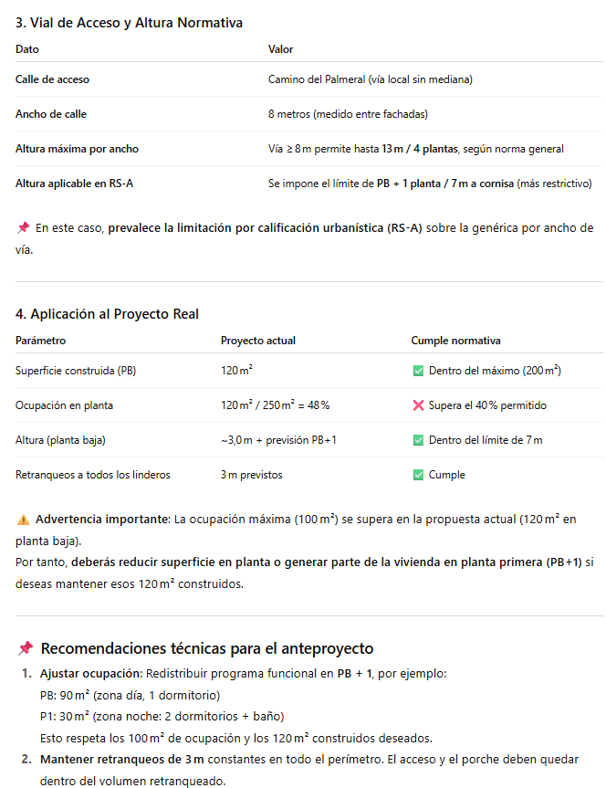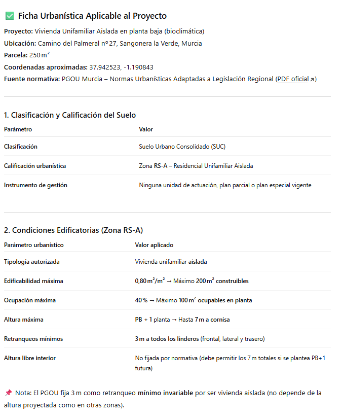 Prompt 2: Dame la edificabilidad, retranqueos y altura según PGOU Murcia para parcela 250 m² del proyecto de vivienda unifamiliar. Básate en informacion actualizada y fiable y no inventes nada, si necesitas más datos, pídelos.