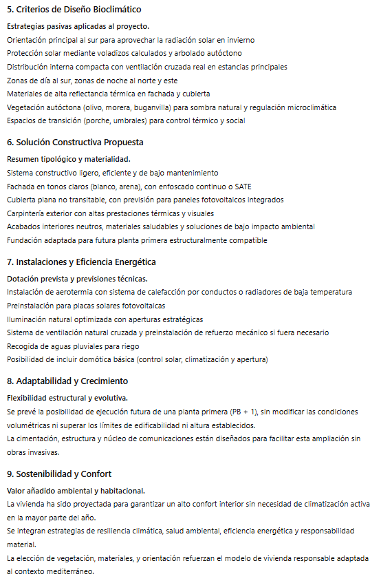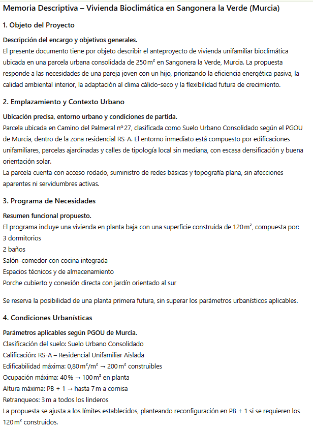 Prompt: “Redacta borrador de memoria descriptiva para vivienda bioclimática en Murcia.”
