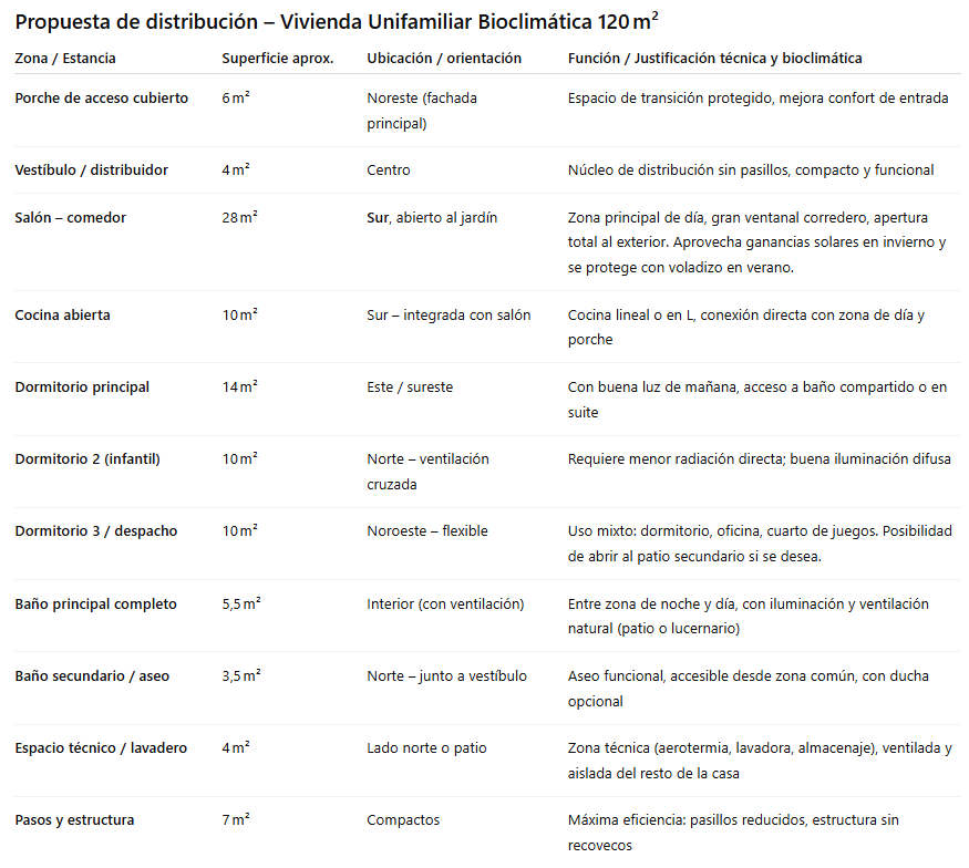Prompt: “Propuesta de distribución para vivienda 120 m², 3 dormitorios, 2 baños, salón al sur, jardín con sombra.”